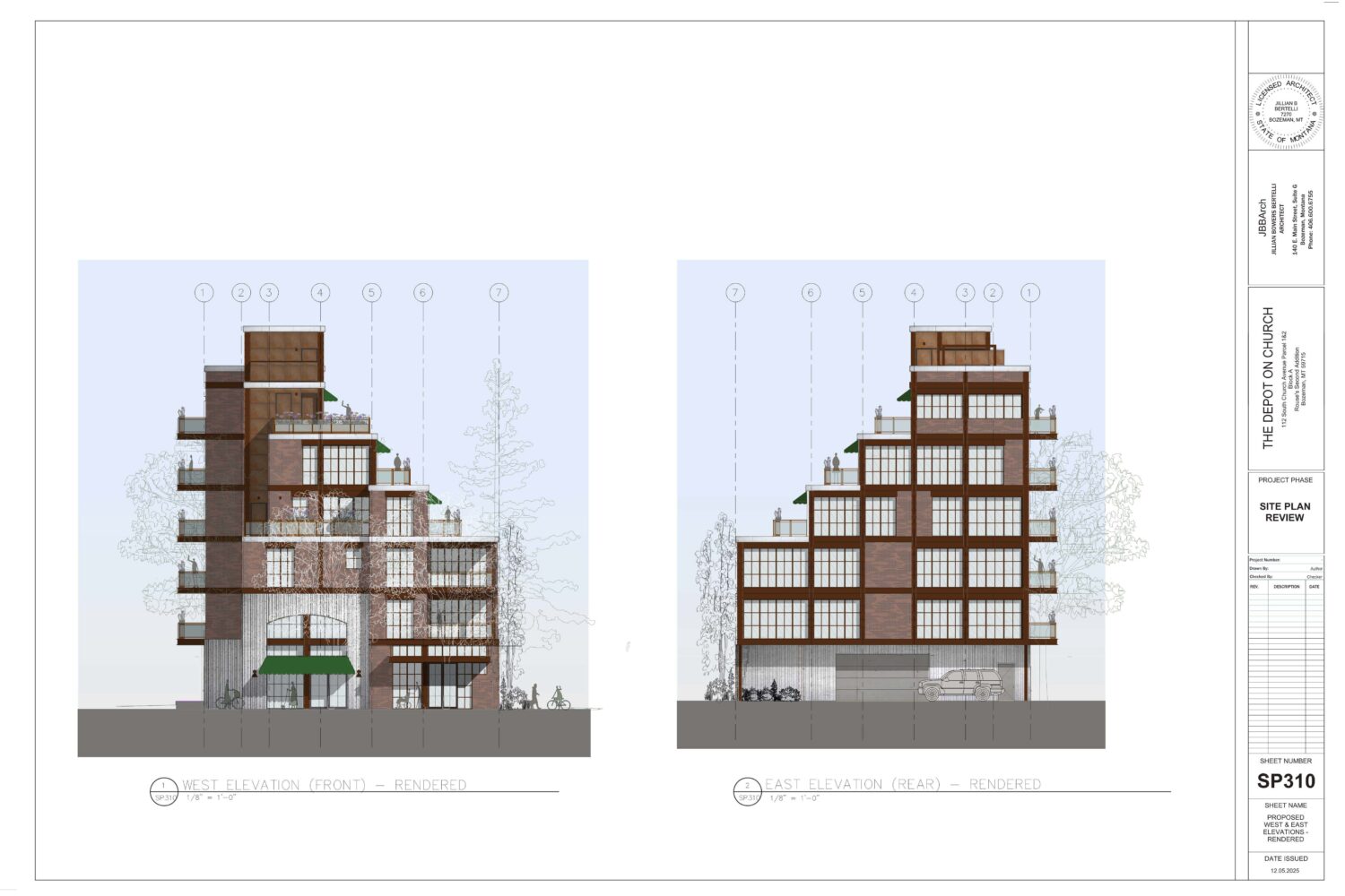 The Depot on Church Avenue is a significant development in Bozeman's B-3 zoning district. The 61,350-square-foot building would stand 82 feet tall (including the rooftop elevator room).