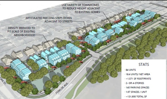 84 new townhomes: Initial plans propose 84 townhome units, two to four stories high with tucked-under garages and off-street parking.