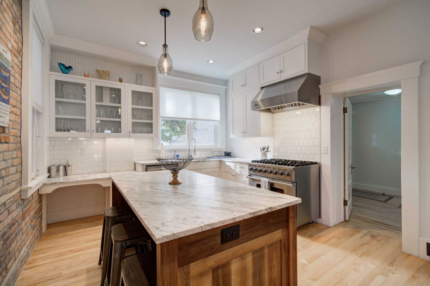 Updates include modernized bathrooms, energy-efficient windows, and upgraded systems, balanced with original wood accents and minimalist finishes. The kitchen combines high-end materials with professional-grade appliances for both style and function.