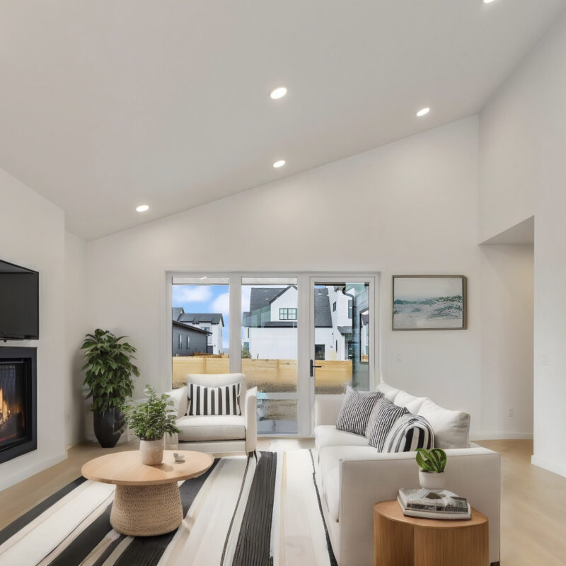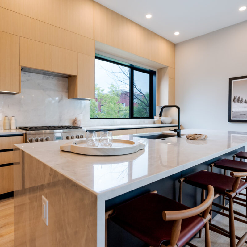 Inside the home, a focus was placed on bringing warmth indoors while still delivering a contemporary feel. The home balances contemporary elegance with comfort, making it feel both stylish and livable. At its heart sits a generous island topped with quartz, offering space for gathering, dining, or simply lingering with morning coffee. Frameless European slab-style cabinetry alternates between warm wood tones and crisp white, grounding the room in natural warmth while keeping it bright and airy. Every detail in this home has been carefully curated - from the modern light fixtures to the seamless blend of materials and finishes. Designed for both gathering and retreat, it’s a home that feels as stunning as it is welcoming.