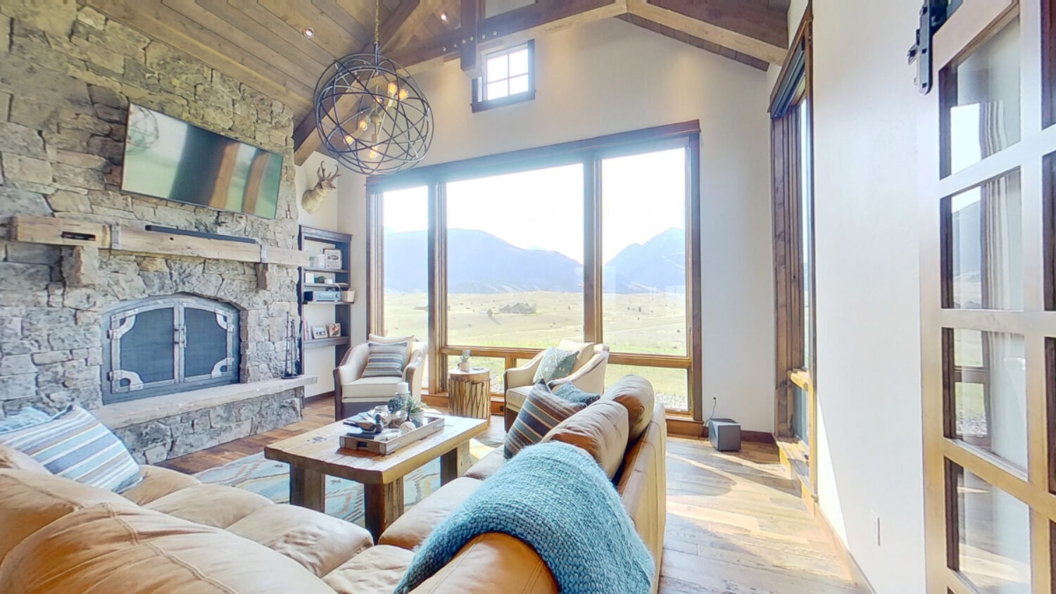 You know you are walking into a special home right when you come up to the front door! Custom stained glass pieces can be found throughout the home along with soaring ceilings, huge windows, and beautiful details. A huge rock fireplace takes center stage in the living room and the pops of red in the kitchen compliment the exposed brick. The master suite features a large bathroom, complete with a walk-in shower and soaking tub with big Bridger views. There are three patios, each featuring spectacular mountain and valley views.
